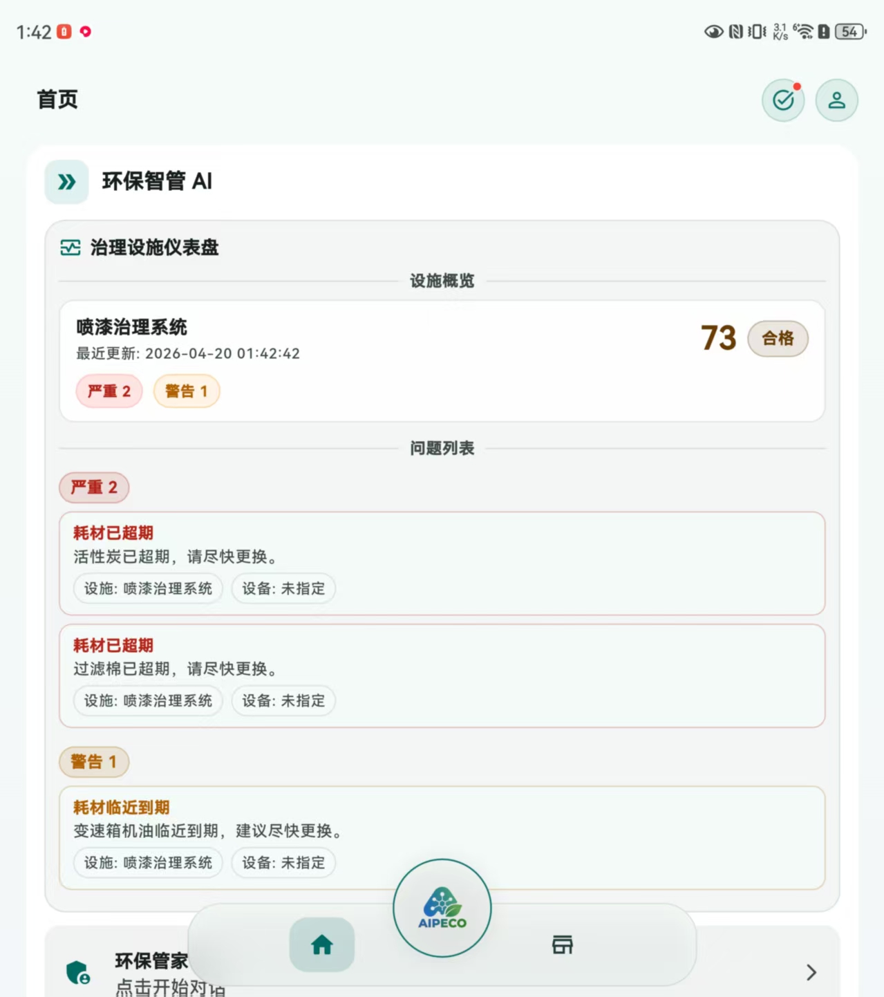 环保智管AI直接给出治理设施运行状态结论与预警